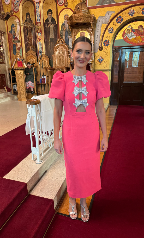 The Posey Puff Sleeve Midi Dress exudes feminine opulence and elegance in rouge red. Featuring beaded bow embellishments, the fitted bodice with front cut outs and rounded neckline perfectly complements the voluminous short puff sleeves, creating a sophisticated silhouette. The pencil midi skirt, cinched at the waist and enhanced with a back split, adds an alluring touch to the design. An invisible back zip fastening ensures a secure fit, while the lining offers utmost comfort. Refined and polished, this dress is a lovely choice for your upcoming event.